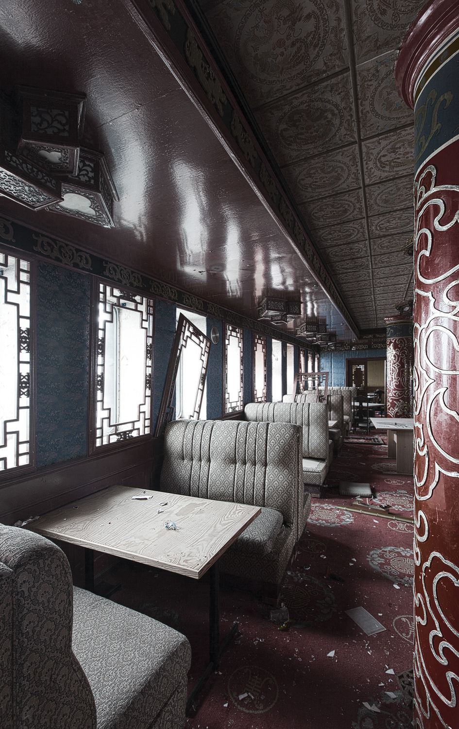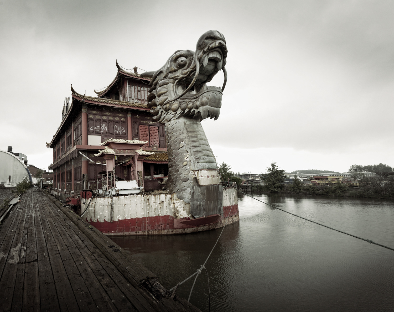 Een vergaan drijvend Chinees restaurant gelegen in de havens van Götenburg.